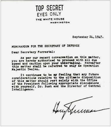 A committee of Defense experts [Majestic 12] was created as part of the National Security Act of 1947 to investigate, guide, and cover up US policy on the ET presence