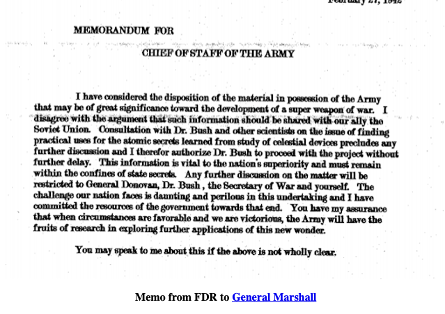 [Vannever Bush [no relation] chaired the NDRC coordinated the activities of 6,000 scientists in the application of science in warfare. He initiated the Manhattan Project and the creation of the National Science Foundation.